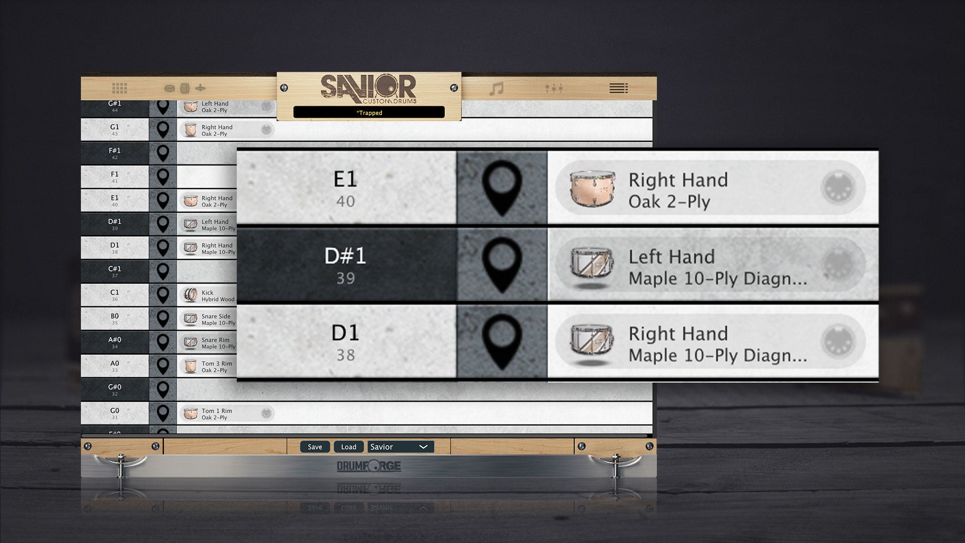 Drumforge Savior Custom Drums takes our sampler concept to an entirely new level, offering more engineering setups than ever before. These setups allow you to take any drum or cymbal and create many different sounds quickly. Switch between different overhead mics on your cymbals and blend in Mid-Side ambience to control their width so they fit perfectly in your mix. Combine different inside and outside kick mics while switching between felt and wood beaters to find the best attack for your mix. Mix several different direct snare mics and versatile ambience combinations to take your snare from natural and tight to big stadium rock in seconds. Create earth shaking low end in your toms with a bottom mic or augment the direct mic with a condenser a few feet up in the air to add new levels of depth. Whatever sound your mix needs is now available to you at the click of a mouse.