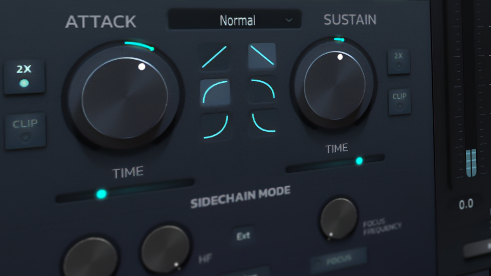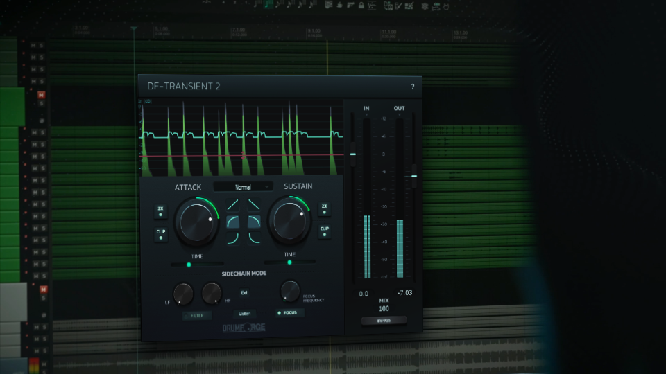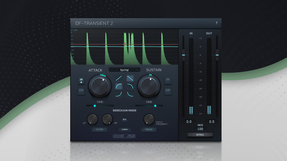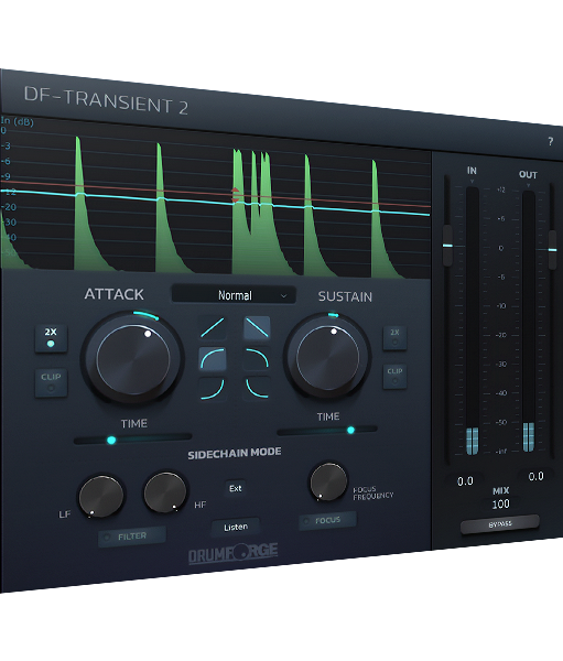 DF-TRANSIENT 2 gives you impressive dynamic shaping flexibility. Take full control over the slope envelope on your attack and sustain to create transformative results on any drum sound. DF-TRANSIENT 2 also features two different sidechain modes, which can be used internally or externally. Filter mode enables you to insert a high pass or low pass filter into the detector circuit so you can target specific frequency ranges. Focus mode allows you to pinpoint a distinct frequency for signal processing. A parallel mix control allows for more organic results when needed.