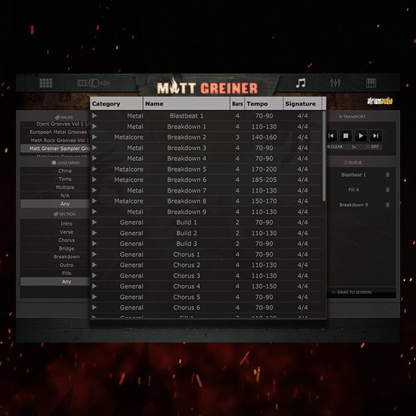 Suffering from writer’s block? The Drumforge Matt Greiner plugin features a simple to use Song Builder designed to make songwriting effortless. Use the Groove & Fill Playlist to quickly find drum grooves and fills. Drag your favorites into the song builder queue to build your song and the intelligent fill logic will automatically insert your selected drum fills at the end of the bars. You’ll spend less time clicking and more time making music, and that’s what matters most.