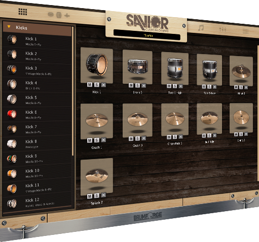 Drumforge Savior Custom Drums takes our sampler concept to an entirely new level, offering more engineering setups than ever before. These setups allow you to take any drum or cymbal and create many different sounds quickly. Switch between different overhead mics on your cymbals and blend in Mid-Side ambience to control their width so they fit perfectly in your mix. Combine different inside and outside kick mics while switching between felt and wood beaters to find the best attack for your mix. Mix several different direct snare mics and versatile ambience combinations to take your snare from natural and tight to big stadium rock in seconds. Create earth shaking low end in your toms with a bottom mic or augment the direct mic with a condenser a few feet up in the air to add new levels of depth. Whatever sound your mix needs is now available to you at the click of a mouse.
